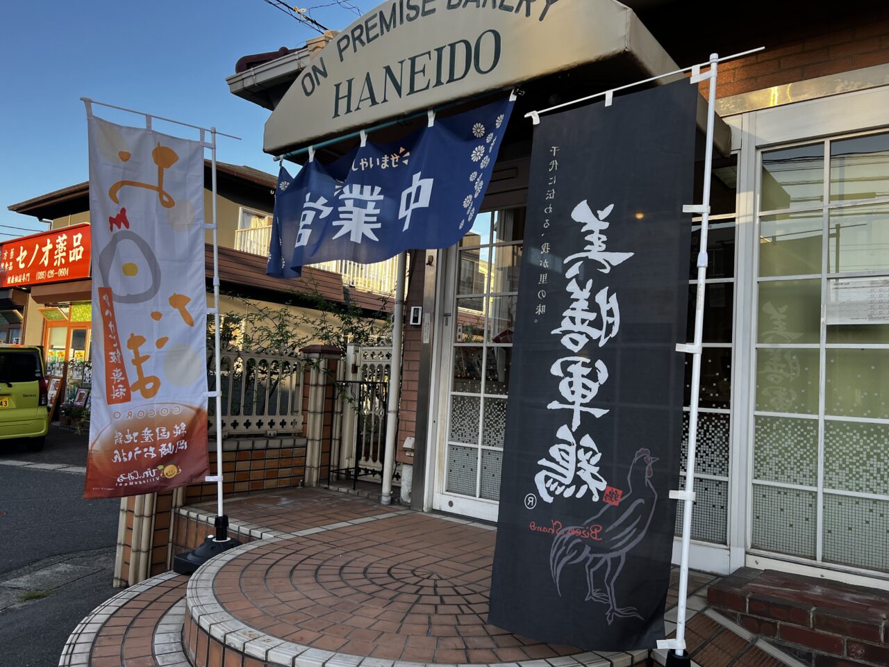 【倉敷市】元パン屋「繁栄堂」のお店の前に「美膳軍鶏」ののぼり旗が立っています。