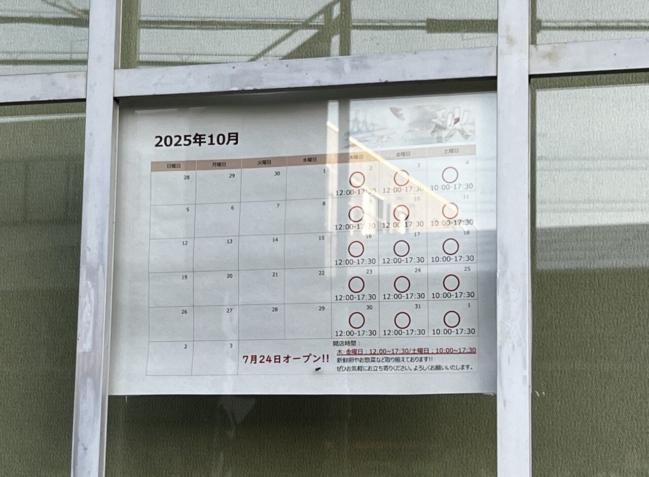 お店のドアにカレンダーがありました。木・金・土に丸がついています。木・金は営業時間は12時から17時半、土曜日は10時から17時となっています。オープンは2025年7月24日と書かれていました。