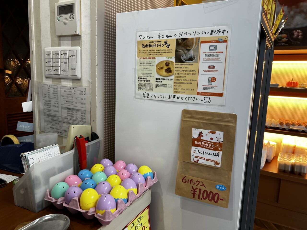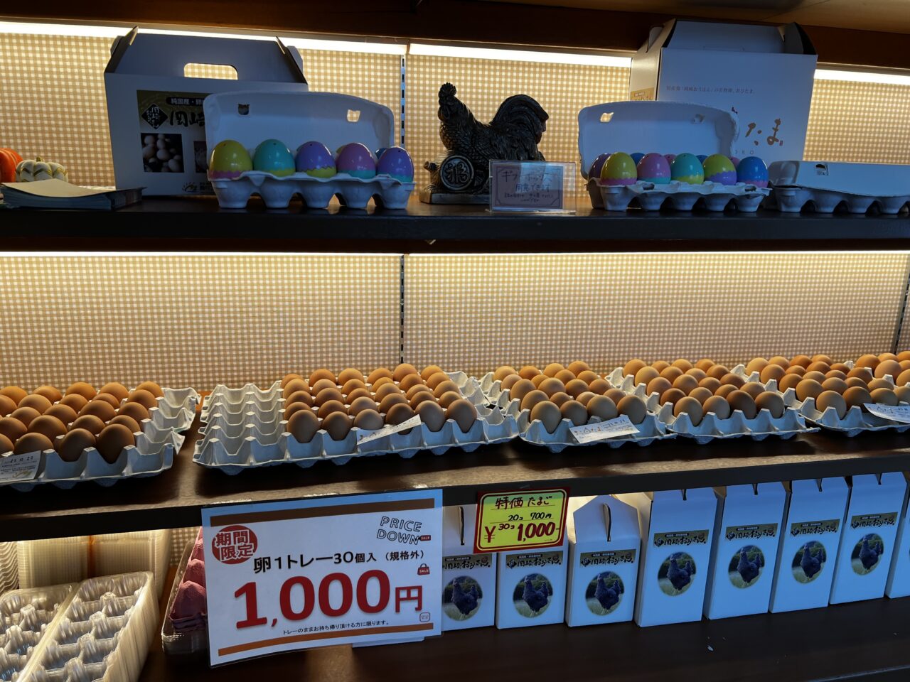 店内に入ると「お日たま」という名前の赤玉がたくさん並んでいました。期間限定で卵1トレー30コ入りが1,000円税込と表示されていました。「規格外」のためのようです。(2025年10月10日現在)20コが700円税込なので、30コが1,000円税込はお得ですね。