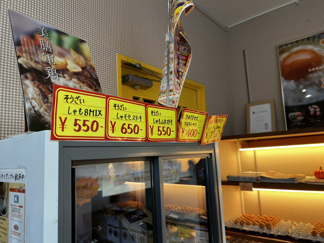 そうざいは「しゃも8MIX550円(税込)・しゃモモステーキ650円(税込)・しゃもムネステーキ550円(税込)・てばさき焼き、てばもと焼き400円(税込)・おためしBOX(3種入り)1,300円(税込)」となっていました。