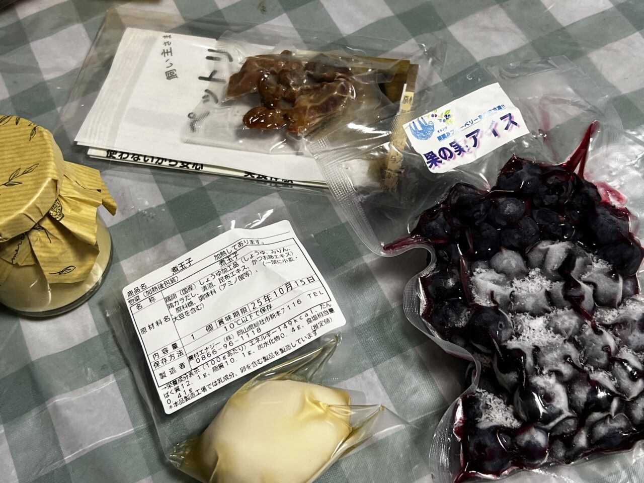 プリン・果の実アイス・煮玉子(試供品)・ペット(試供品)を持ち帰り、早速いただきました。プリンはとろける食感の美味しいプリンでした。