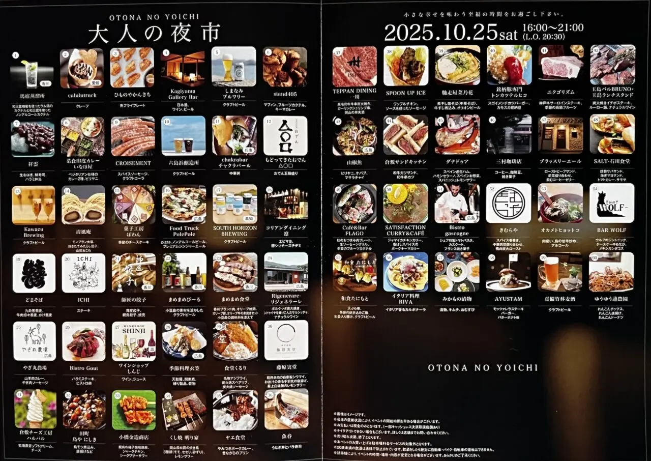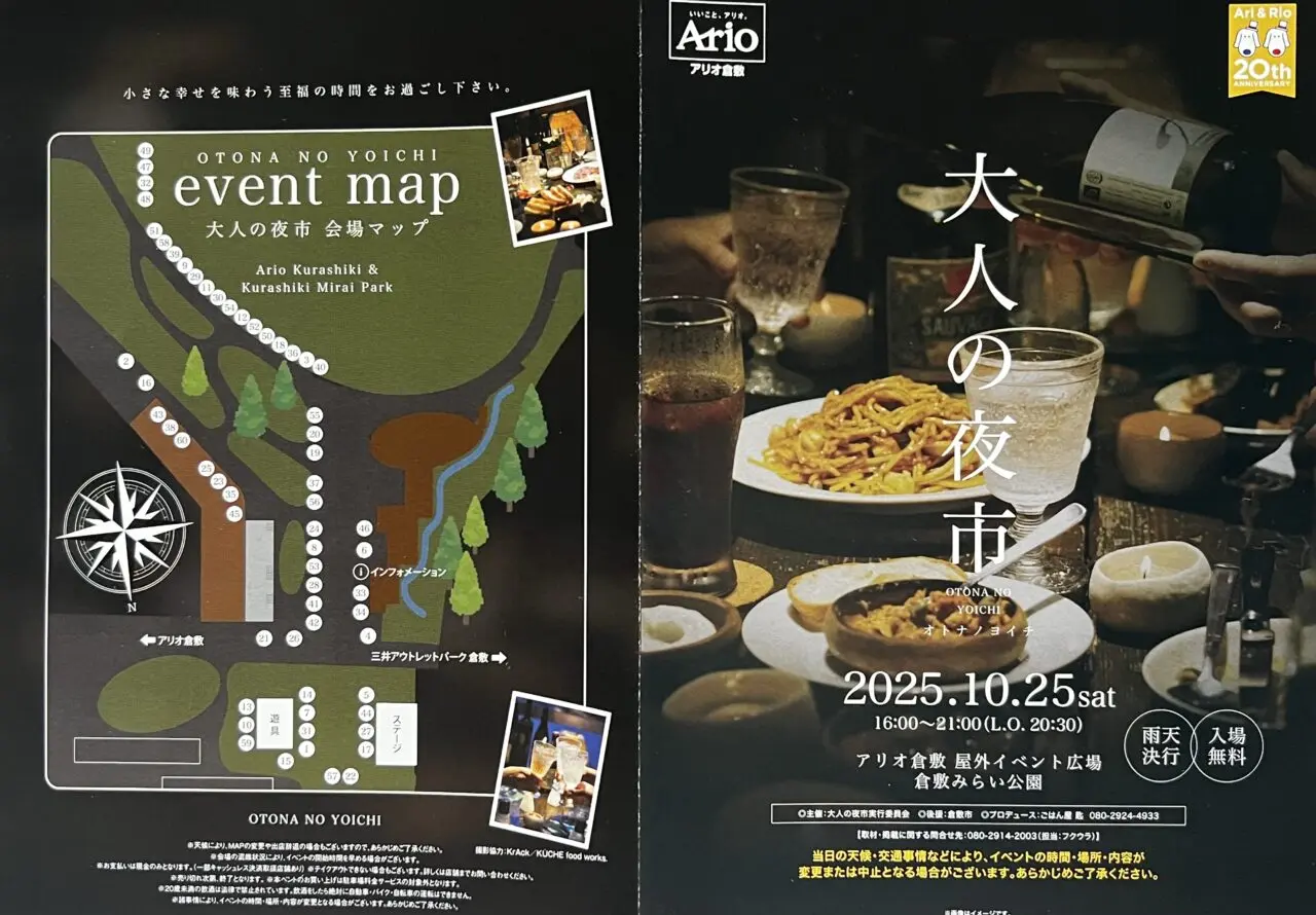 「大人の夜市」が2025年10月25日(土)に開催されます。時間は、16時から21時(ラストオーダー20時半)となっています。