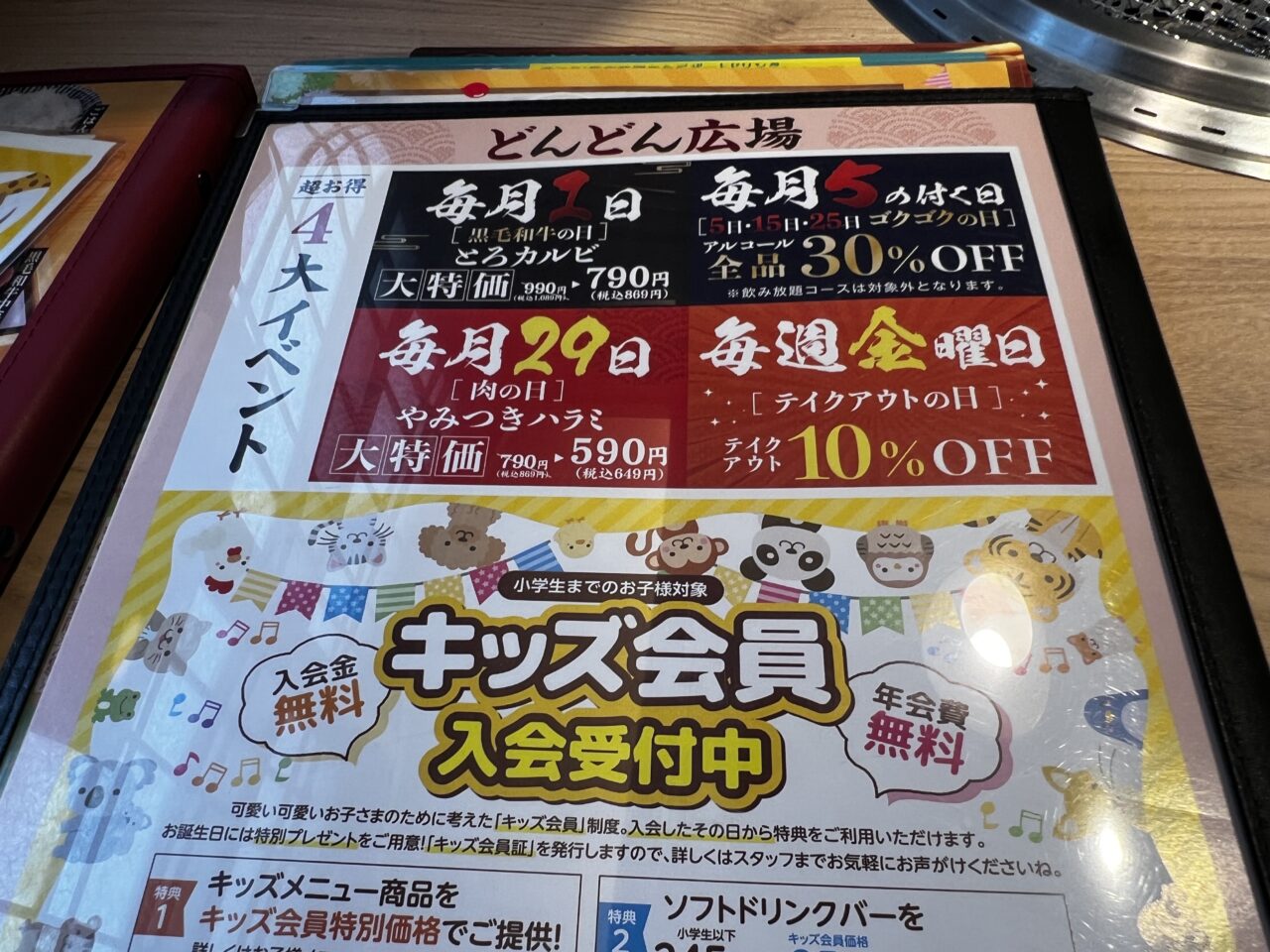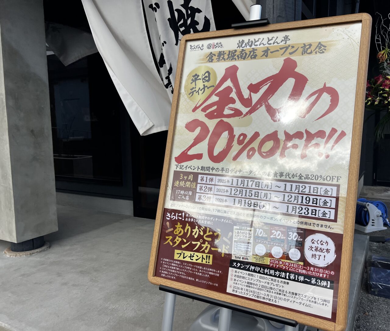 入り口前に「焼肉どんどん亭 倉敷堀南店オープン記念」として、「平日ディナーが20%OFF」という看板が立っていました。第1弾はすでに終了しています。第2弾は12月15日(月)~19日(金)、第3弾は2026年1月19日(月)~23日(金)となっています。