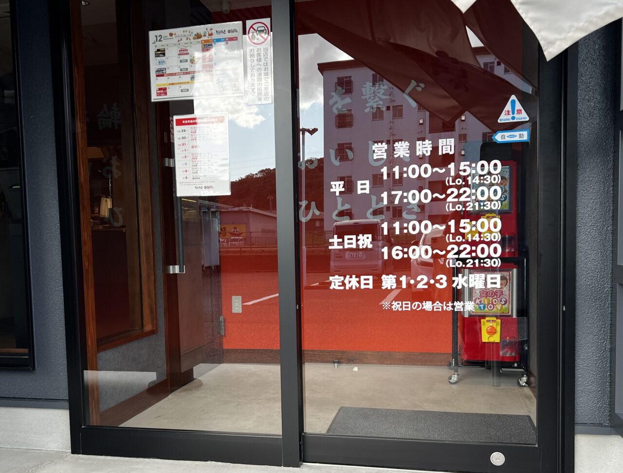 営業時間がドアに書かれています。平日は11時から15時(L.O14:30)・17時~22時(LO21:30)、土日祝は11時から15時(L.O14:30)・16時~22時(LO21:30)、定休日は第1・2・3の水曜日です。(※祝日の場合は営業)