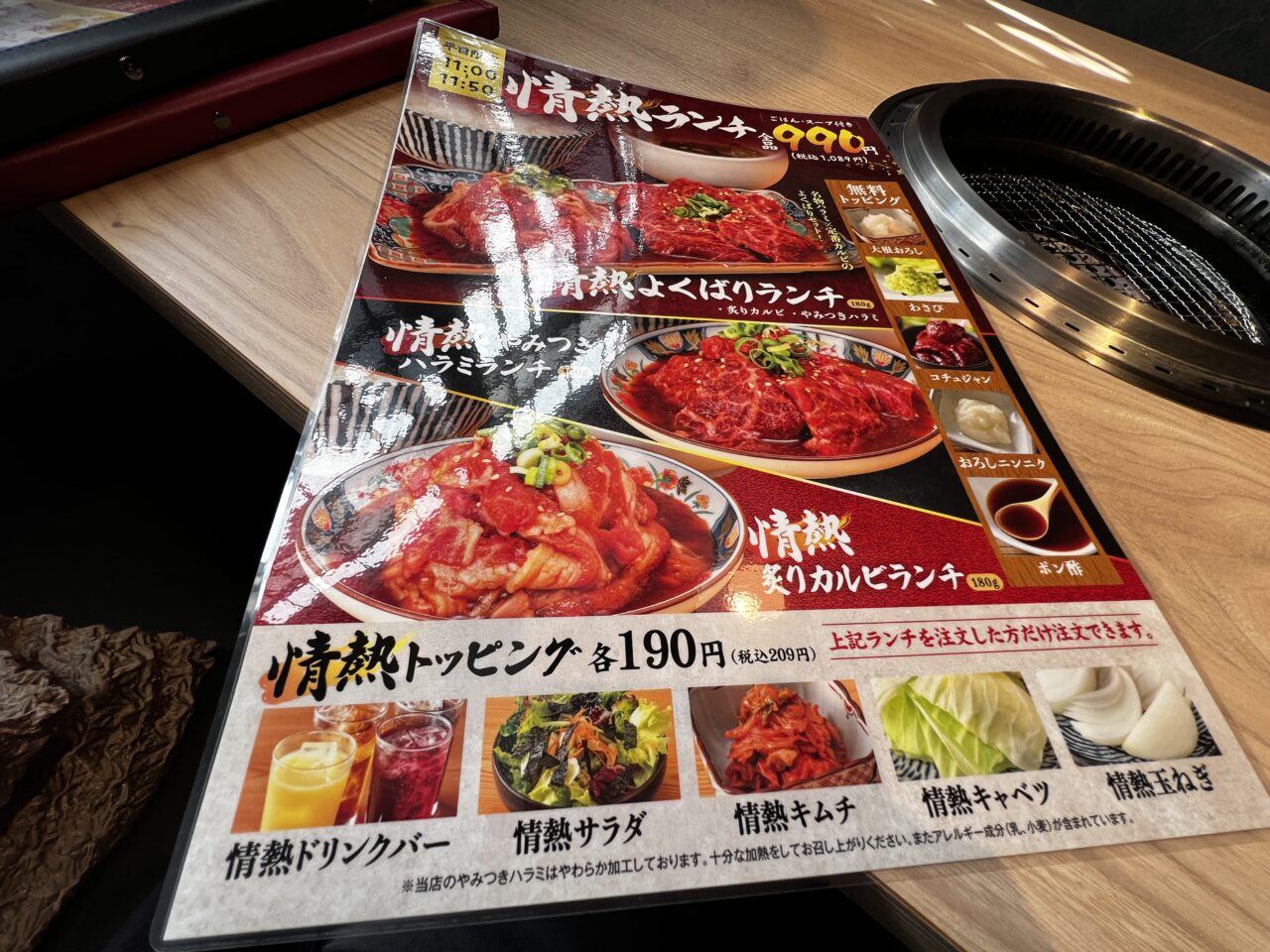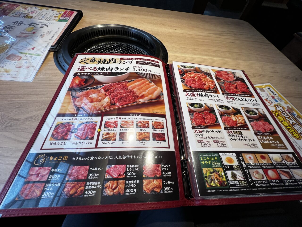 ランチメニューが豊富です。選べる焼肉ランチは、ごはん、キムチ、スープ、ドリンクバー付きで、「旨味カルビまたはやみつきハラミ」のどちらか一品と「もち豚カルビ、もち豚とんトロ、鶏もも、国産ふりそで、やげんナンコツ、レバー、てっちゃん(大腸)、ハツ」の中から二品を選びます。足りなければちょこ肉をプラスするというのも良いですね。