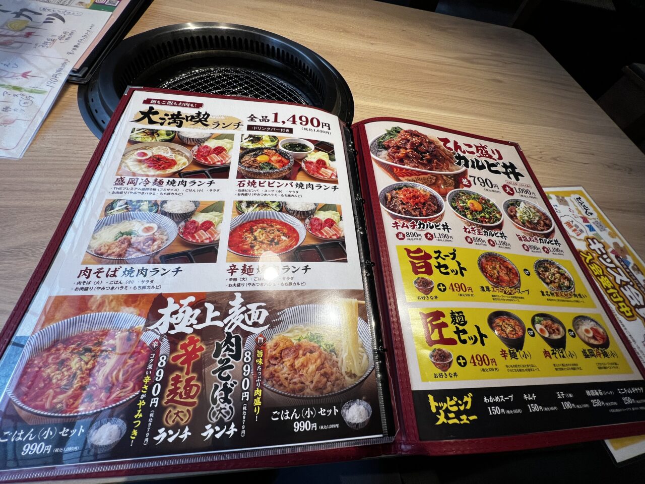 この日注文した商品は「大満喫ランチ」です。「盛岡冷麺焼肉ランチ」「石焼ビビンバ焼肉ランチ」「肉そば焼肉ランチ」「辛麺焼肉ランチ」から、「辛麺焼肉ランチ」を選びました。(いずれもドリンクバー付きでしたが、ドリンクバーを利用するのを失念していましたので残念ながらドリンクは飲んでいません。)