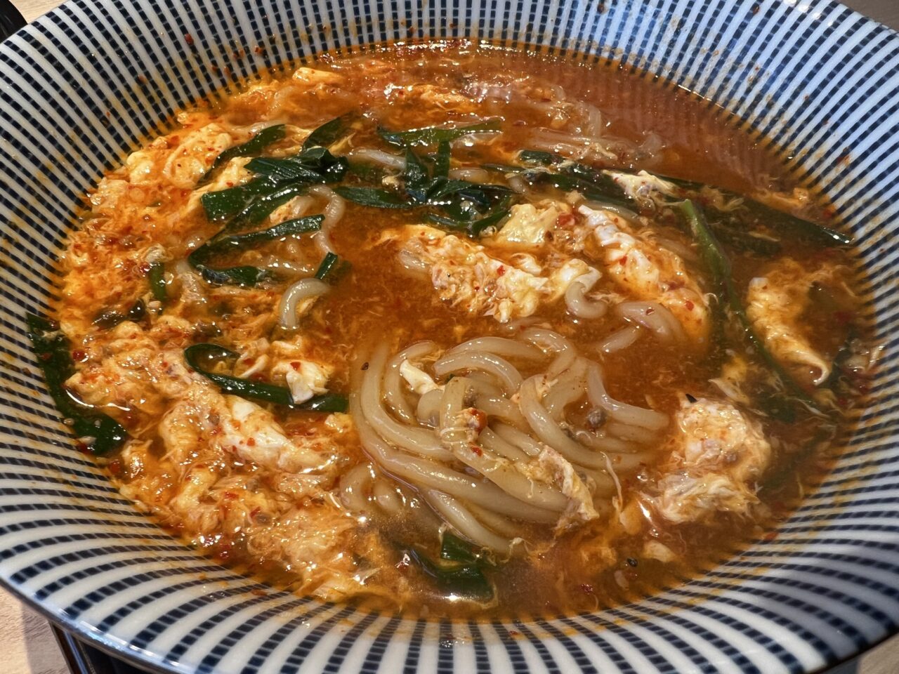 辛麺は麺が中太丸麺ですが、普通の麺とは違い、そば粉と小麦粉を混ぜたもので、こんにゃくのような食感を持つ麺でした。