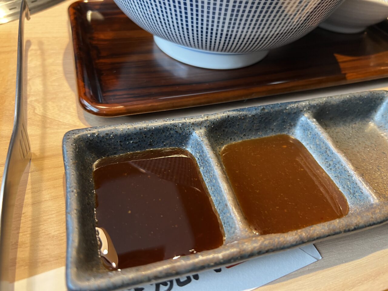 タレは3種類から好きな物を選べますが、辛いタレは卓上に置いていないのでスタッフに頼んでください。