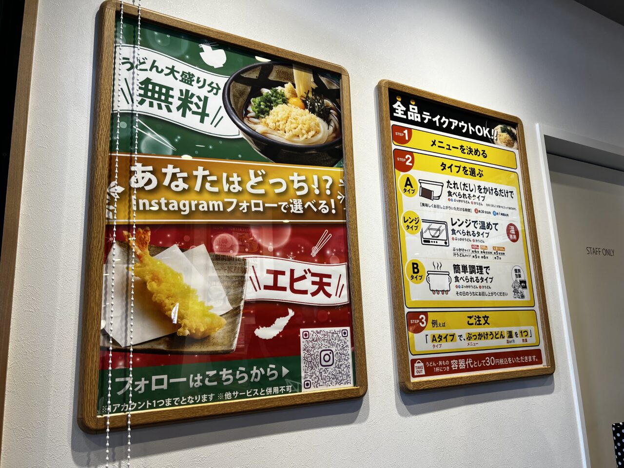 全品テイクアウトができます。メニューを決めて→タイプ(Aタイプ:たれ(だし)をかけるだけで食べられるタイプ、レンジタイプ:レンジで温めて食べられるタイプ、Bタイプ:簡単調理で食べられるタイプ)を選んで→ご注文例「Aタイプでぶっかけうどん温を1つ」うどん・丼物一杯につき容器代として30円(税込)が必要です。