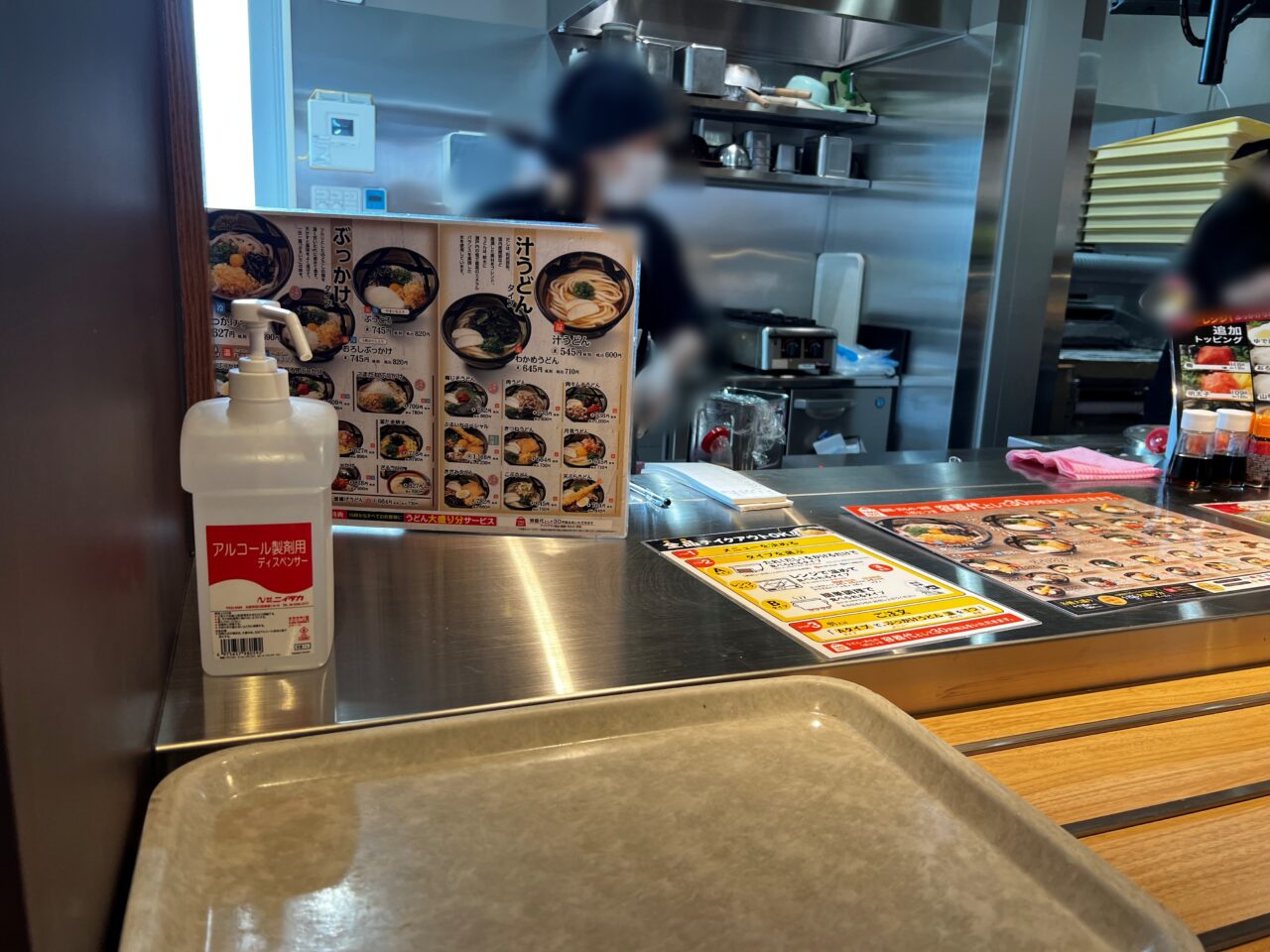 すぐにうどんを準備していただけますので、受け取ってトレイに乗せて右に進みます。