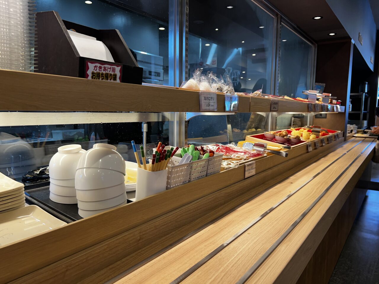 おにぎり・いなり寿司・天ぷらなど欲しいものをトレイに乗せて右へ進みお会計をします。