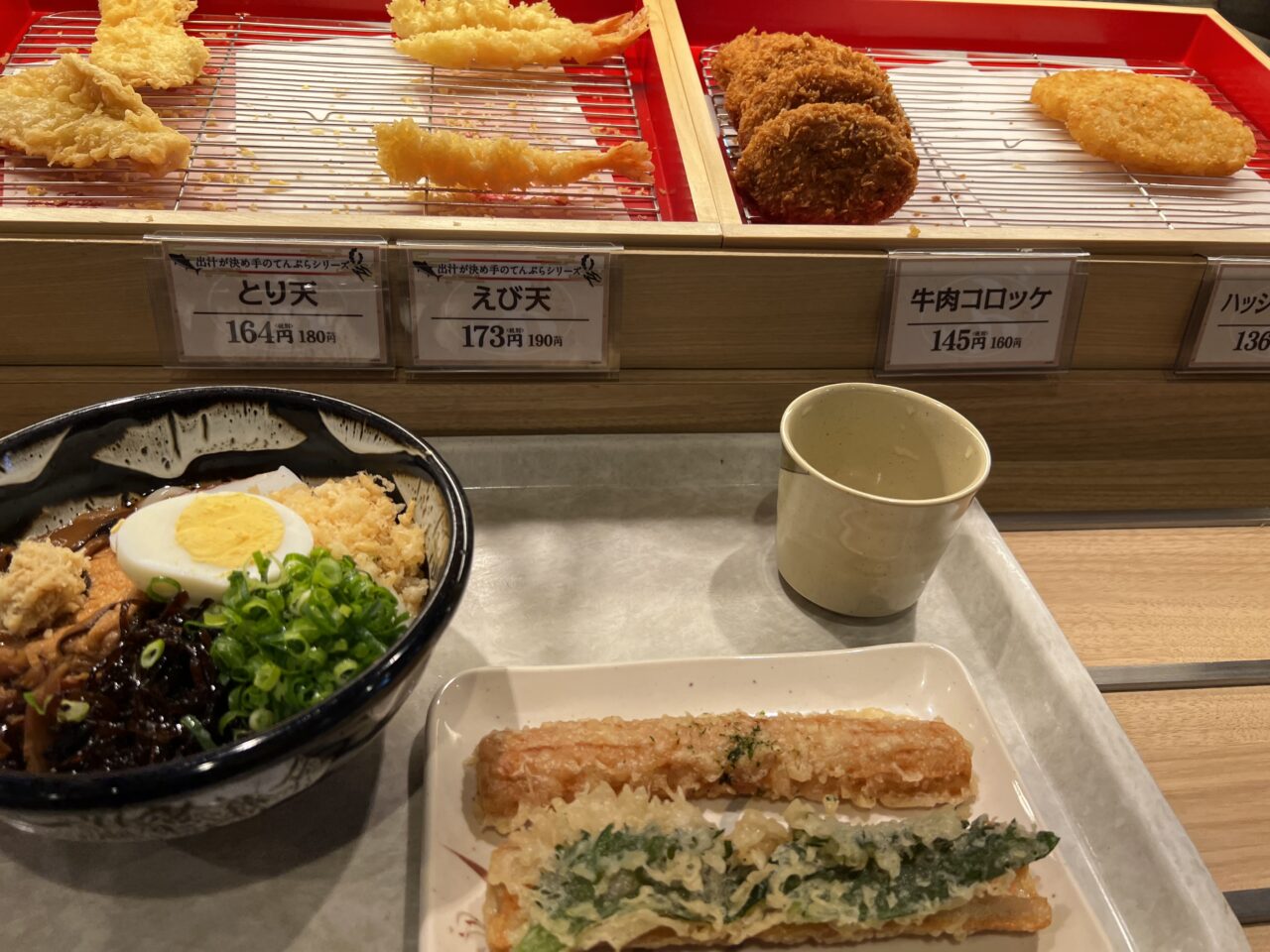 私はちくわ天と明太子ちくわ天を選びました。他にも美味しそうなとり天やえび天、牛肉コロッケ、ハッシュドポテトもありました。