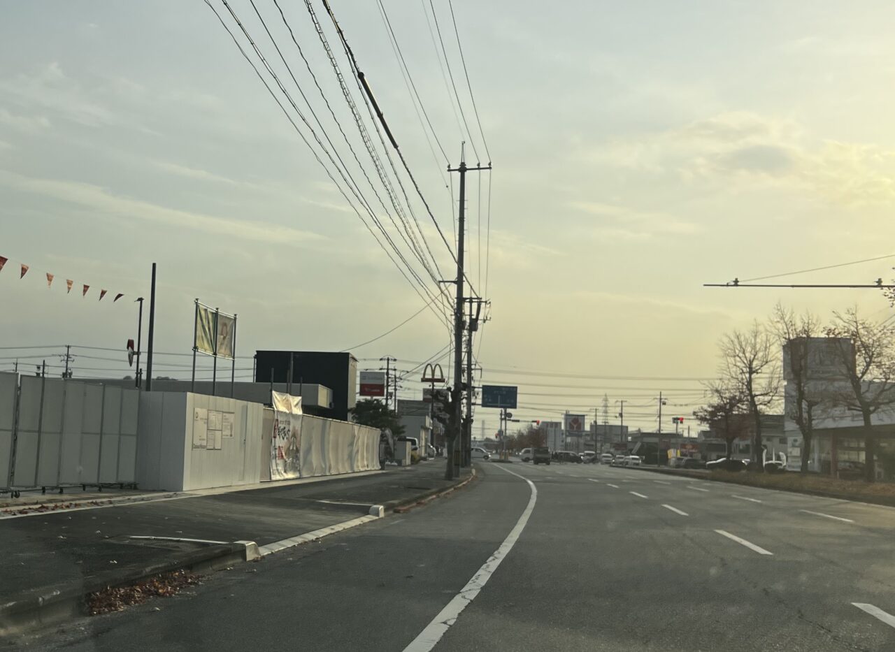 「マクドナルド倉敷連島店」の交差点を北に進むと、すぐ右手側に工事中のフェンスが見えました。(写真は焼肉きんぐからマクドナルドを見たところです)