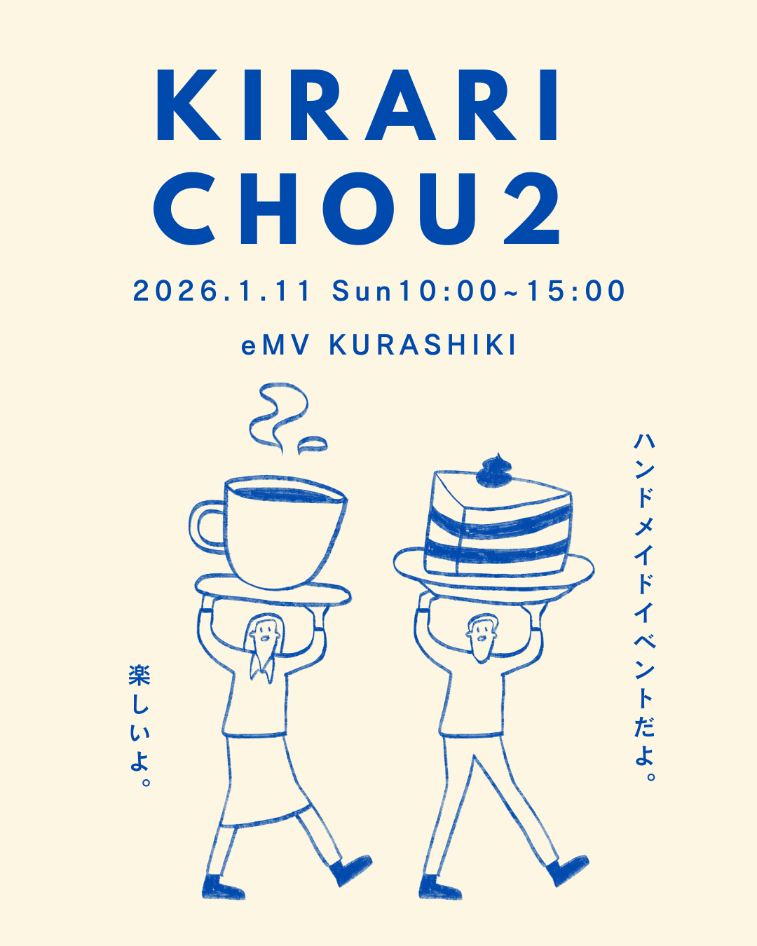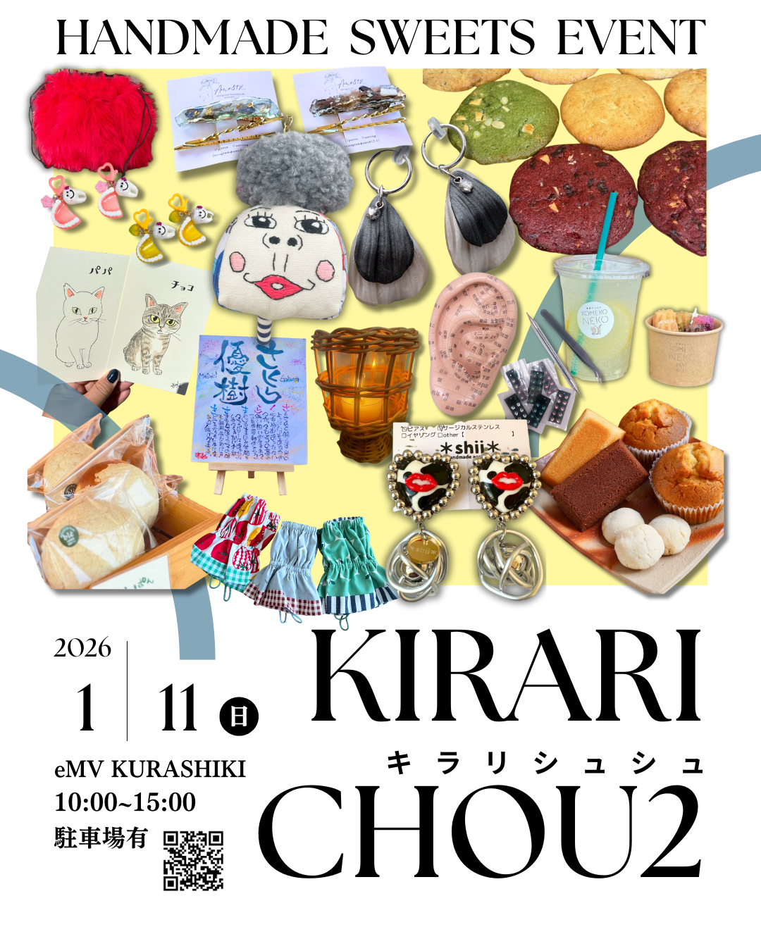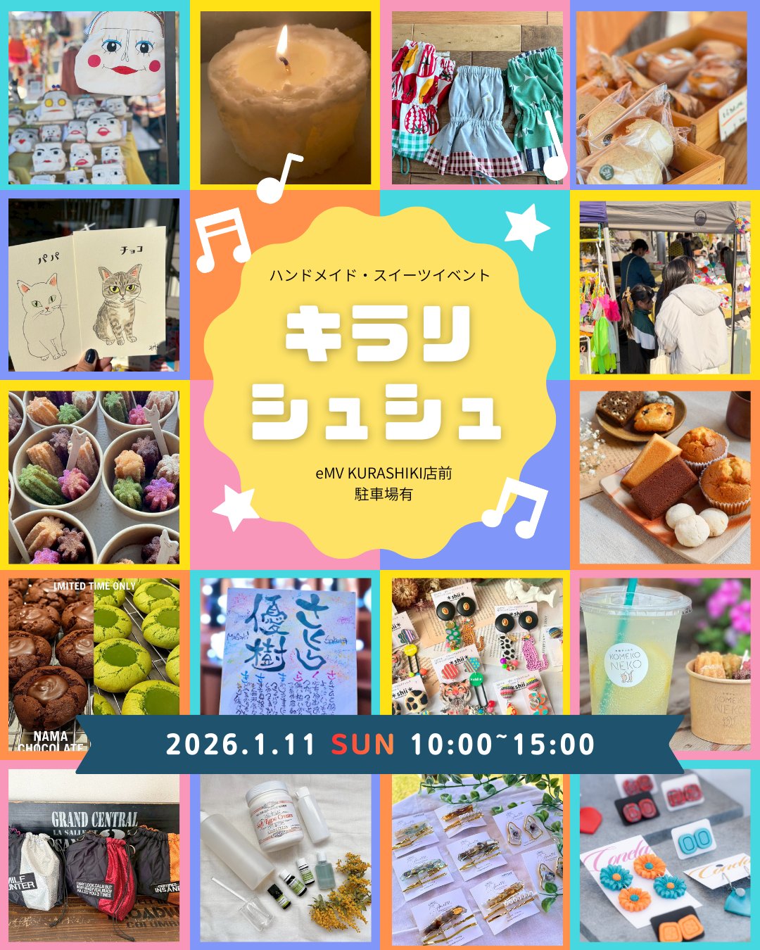 倉敷市新田にある雑貨店eMV倉敷店さんのお店の前で月に1度開催される、ハンドメイド・ワークショップスイーツのイベントが、2026年1月11日(日)に開催されます。