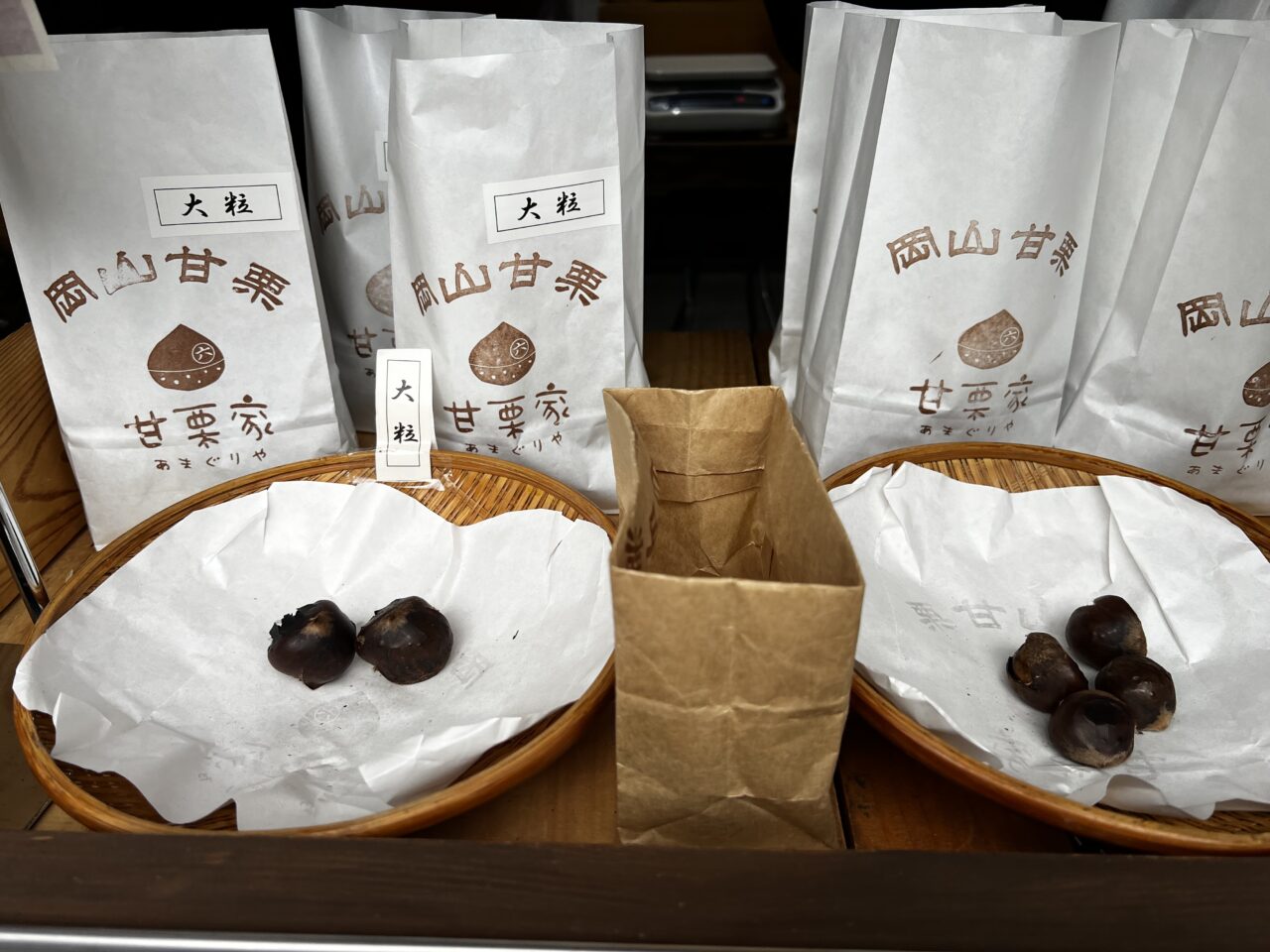 店頭で岡山甘栗の大粒と通常サイズの2種類を試食させてくださいました。どちらも美味しくて迷いました。大粒は大きいので1粒でも食べ応えがあります。同じグラム数だと大粒の方が数は少し少な目ですので、数が多い方を購入しました。