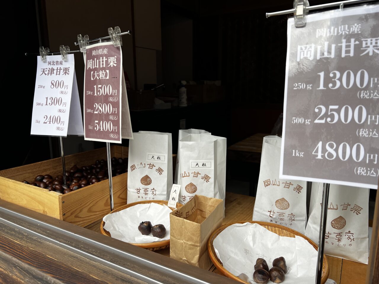 お値段は250gの通常つぶ1,300円、大粒1,500円、天津甘栗800円となっていました。(すべて税込み価格です)