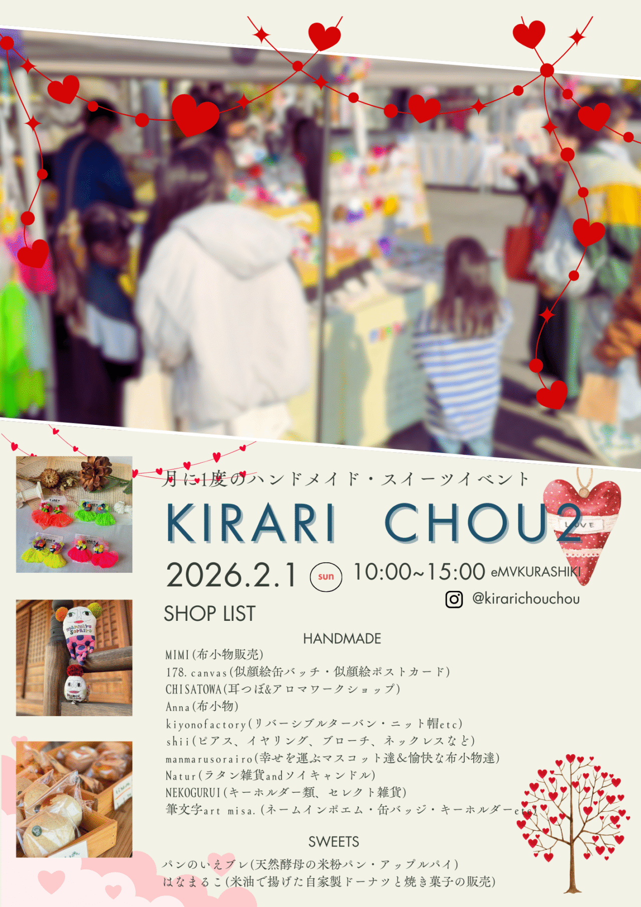 倉敷市新田にある雑貨店eMV倉敷店さんのお店の前で月に1度開催されるハンドメイド・ワークショップスイーツのイベント「キラリシュシュ」が、2026年2月1日(日)に開催されます。開催時間は 10:00~15:00、開催場所はeMV倉敷店前です。
