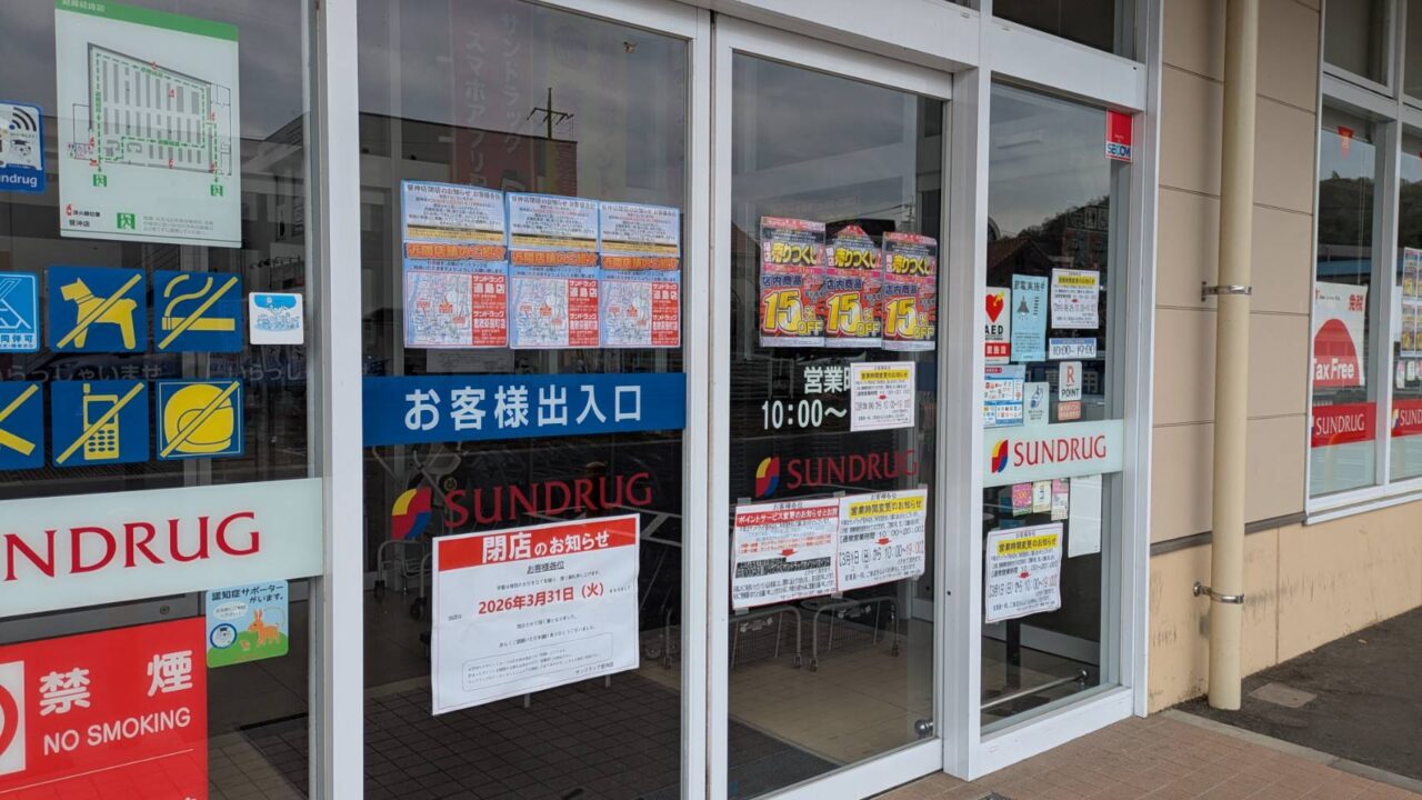 【倉敷市】笹沖にあるドラッグストア「サンドラッグ笹沖店」が3月31日をもって閉店していました。