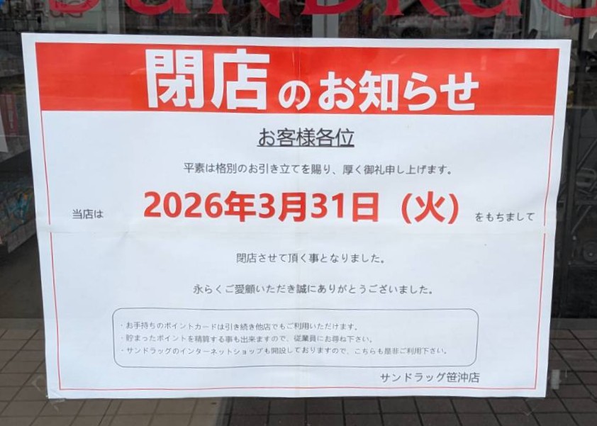 2026年3月31日(火)に、笹沖にあるドラッグストア「サンドラッグ笹沖店」が閉店しました。