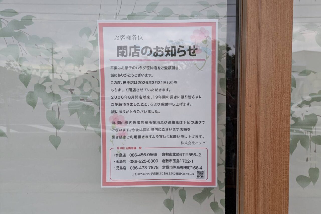 【倉敷市】笹沖にある老舗菓子店「ハタダ笹沖店」が3月31日をもって閉店したそうです。